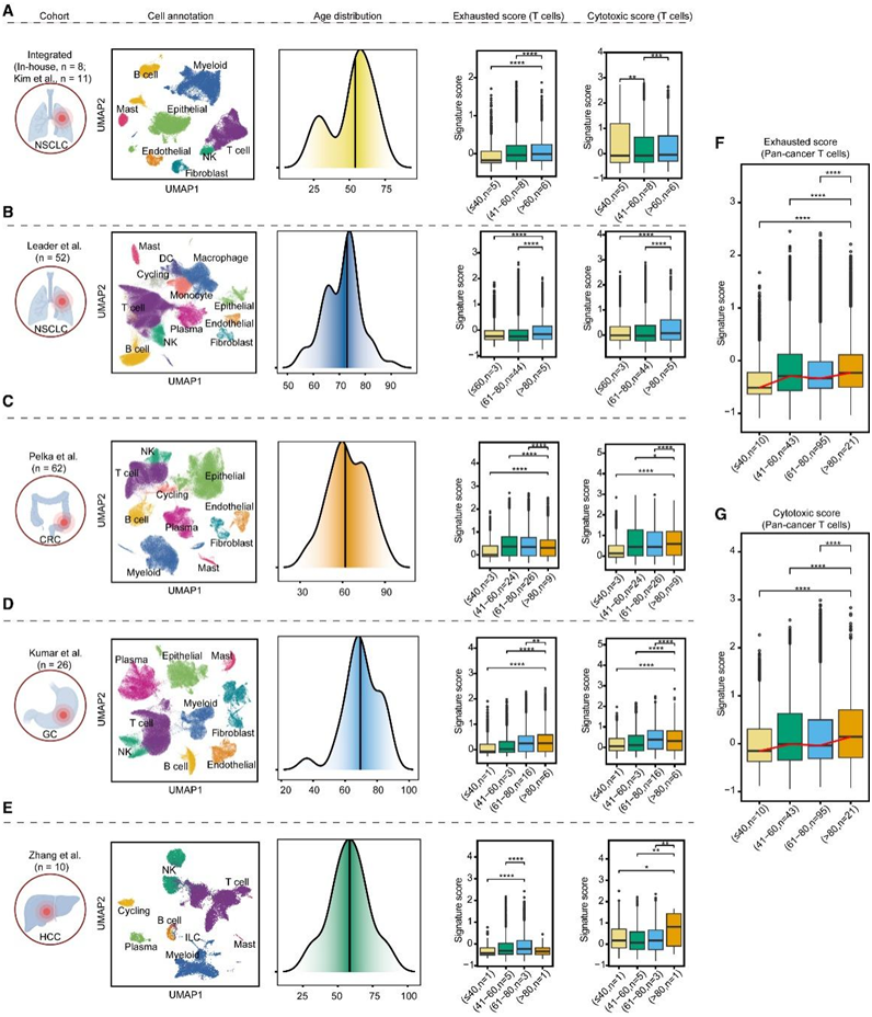 (A–E) 来自五项研究的 scRNA-seq 数据,包括整合性 NSCLC、独立 NSCLC、CRC、GC和 (HCC) 队列。(F-G) 箱线图显示了各个年龄组之间在泛癌水平上两个 T 细胞特征评分的差异。
