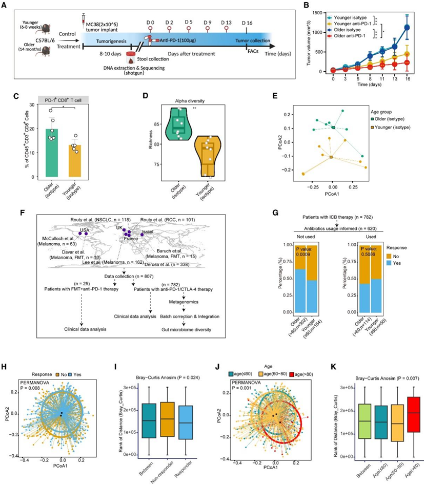 (A) 小鼠实验的工作流程。(B) 老年和年轻小鼠中 MC38 肿瘤的生长动力学。(C)对照组老年和年轻 MC38 肿瘤之间PD-1 + CD8 + T 细胞的比例比较。(D) 小提琴图,比较老年小鼠和年轻小鼠之间的 α 多样性(丰富度)差异。(E) PCoA 图显示老年小鼠和年轻小鼠之间 β 多样性的差异。(F) 显示样本收集和分析主要步骤的工作流程。(G) 比较老年和年轻患者在抗生素使用方面的反应率的堆积图。(H-J) PCoA 图显示了有无反应组和各年龄组之间 β 多样性的差异。(I-K) Bray-Curtis 距离的箱线图。