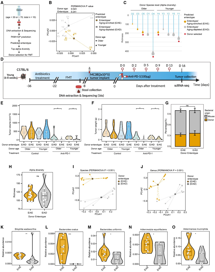 鉴于在 E/AE 肠型中观察到的 ICB 反应增强,他们试图探究 E/AE 个体的肠道微生物群落是否可能增强 ICB 反应。为了研究这一点,他们开发了一个执行 FMT 实验流程(图 5 A)。他们招募了五个年轻(年龄< 30)和5个年老(年龄> 70)的健康志愿者,并收集他们的粪便进行宏基因组测序,随后应用肠道型PAM分类器。4个和6个供体分别预测为E/AE和E/AD(图5B),这在很大程度上跨越了获得的肠型的多样性。他们选取富度较高的老年组和年轻组预测E/AE和E/AD供体进行FMT实验(图5C)。具体来说,用ATBs处理C57BL/6小鼠,并通过灌胃转移供体来源的粪便物质,小鼠植入MC38细胞并接受抗pd -1治疗(图5D)。无论供体年龄如何,与接受 E/AD 供体 FMT 的小鼠相比,接受 E/AE 供体 FMT 的小鼠肿瘤生长(肿瘤体积和重量)显著减少(图 5E-F)。