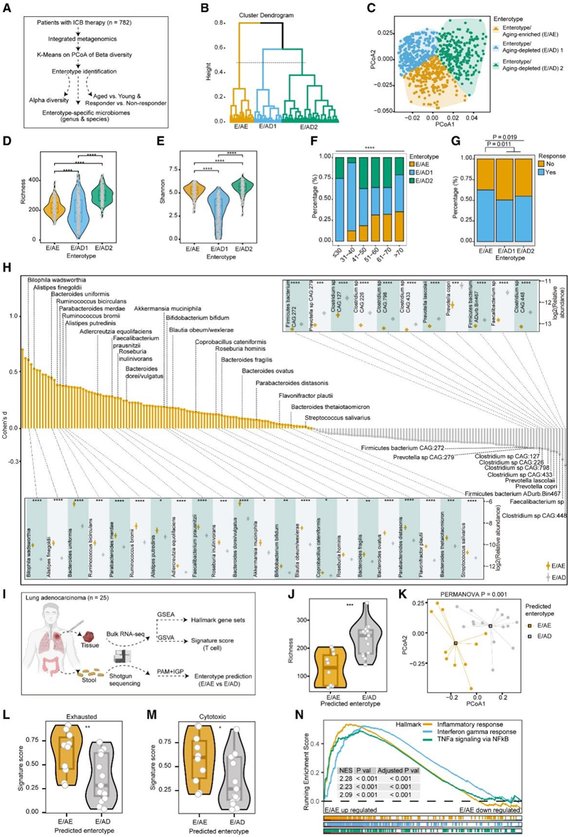 (A) 识别肠型的工作流程。(B) 聚类树状图,显示基于层次 k 均值聚类的聚类,其中树可以分为三个聚类。(C) 点图描绘了根据距离矩阵执行的前两次主坐标分析 (PCoA) 中每个样本的坐标。(D-E) 根据不同肠型的丰富度和α 多样性指数的小提琴图。(F-G) 堆积条形图,显示不同年龄范围或 ICB 反应的肠型样本频率。(H) 条形图显示两种肠型之间丰富物种的差异。(I) 显示内部肺腺癌队列分析的工作流程。(J) 小提琴图显示预测肠型之间的α多样性(丰富度)。(K) PCoA 图显示预测肠型之间 β 多样性的差异。(L-M)小提琴图比较了预测肠型之间 T 细胞耗竭和细胞毒性的特征分数。(N) GSEA 图显示了预测的 E/AE 中三个上调的标志信号通路。
