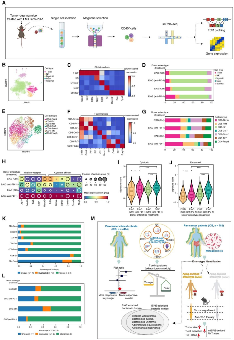 (A) 小鼠 scRNA-seq 数据分析的工作流程。(B-E) UMAP 图显示所有单细或 T 细胞。(C,F) 热图显示细胞主谱系或 T 细胞亚群的细胞标记物的表达谱。(D,G) 堆积图显示按相应供体肠型和治疗分隔的小鼠组中细胞类型的比例。(H) 热图显示小鼠组中 T 细胞功能标记的表达。(I-J) 小提琴图比较了小鼠组间细胞毒性和耗竭 的 T 细胞特征评分的差异。(K-L) 堆积条形图,显示不同 T 细胞亚型或小鼠组中 T 细胞的 TCR 分布。(M) 本研究主要发现的总结。