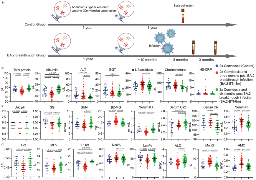 图1. Omicron BA.2 突破性感染 (BTI) 康复者的研究设计和常规血液检查结果。