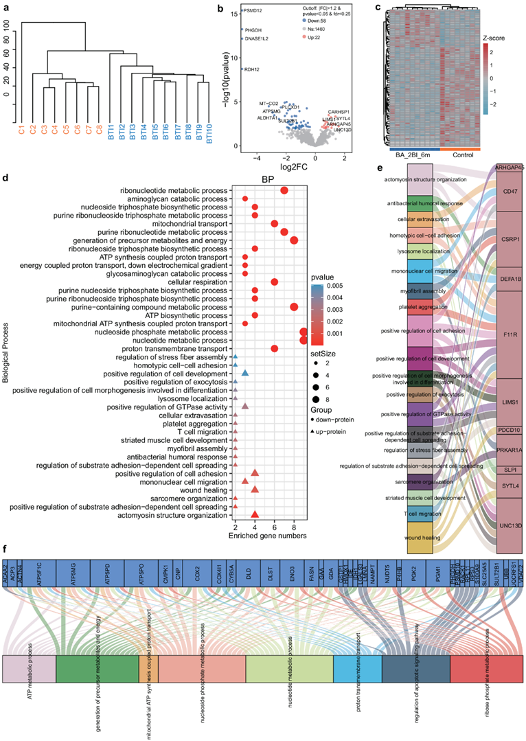 (a) 树聚类图描述了两组之间的样本分离。(b) 火山图显示了两组之间的差异蛋白。(c) 热图显示了对照组和 BA.2-BTI-6m 组中的差异蛋白。(d) 气泡图显示富集的差异表达蛋白的生物学过程和功能。(e) 桑基图显示了上调蛋白质和富集生物过程之间的关系。(f) 桑基图显示下调蛋白质和富集生物过程之间的关系。