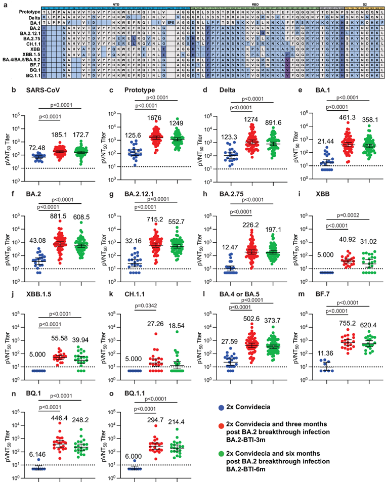 (a) SARS-CoV-2 变体刺突蛋白的突变。(b-o) 50%假病毒中和滴度(pVNT50)分析。