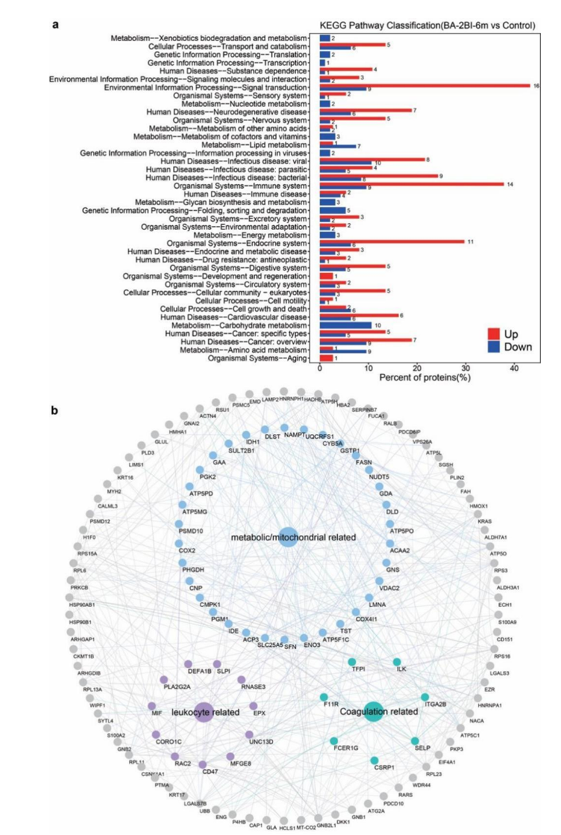 (a)与对照组相比,BA.2-BTI-6m的可变蛋白分布。该图显示了每个Level2 KEGG通路上注释的可变蛋白的比例(%)。(b)可变的蛋白质-蛋白质相互作用。