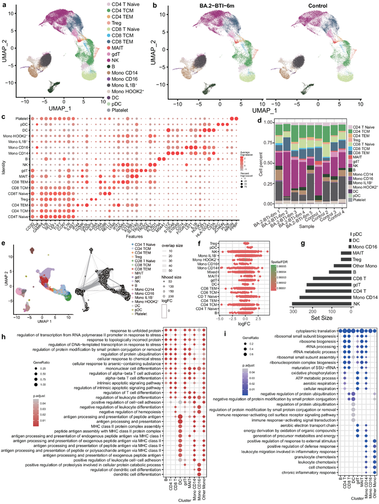 (a) UMAP图表显示 PBMC 的细胞类型和聚类。 (b) UMAP图显示了对照组和BA.2-BTI-6m组中PBMC的细胞类型和聚集。(c) 具有对应于不同细胞类型的标记基因的点图。(d) 堆叠条形图显示单个样本中不同细胞类型的比例。(e) UMAP图显示了对照组和基于Milo算法识别的BA.2-BTI-6m组之间细胞组成的差异。(f) 显示了基于 Milo 算法识别的对照组和 BA.2-BTI-6m 组中细胞组成的差异倍数。(g) 对照组和BA.2-BTI-6m组不同细胞类型中差异表达基因的数量。 (h) 气泡图显示不同细胞类型中显著上调的基因富集的生物功能。(i) 气泡图显示不同细胞类型中显著下调的基因富集的生物功能。
