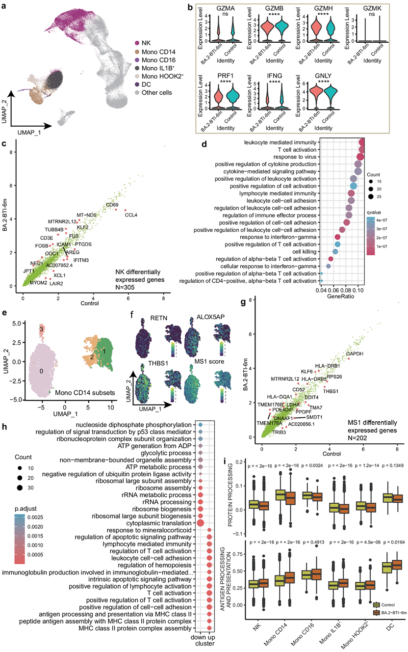 (a) UMAP图可视化先天免疫细胞的类型和聚类。(b) 小提琴图显示对照组和 BA.2-BTI-6m 组中 NK 细胞效应蛋白的表达水平。(c) 火山图显示两组 NK 细胞中差异表达的基因。(d) 气泡图显示 NK 细胞中差异表达基因富集的生物学功能。(e) UMAP 图显示 CD14 单核细胞亚群。(f) UMAP 图显示 MS1 细胞基因标记的表达水平。(g) 火山图显示两组 MS1 细胞中差异表达的基因。(h) 气泡图显示 MS1 细胞中差异表达基因富集的生物功能。(i) 箱线图显示先天免疫细胞的蛋白质加工和抗原呈递活性评分的差异。