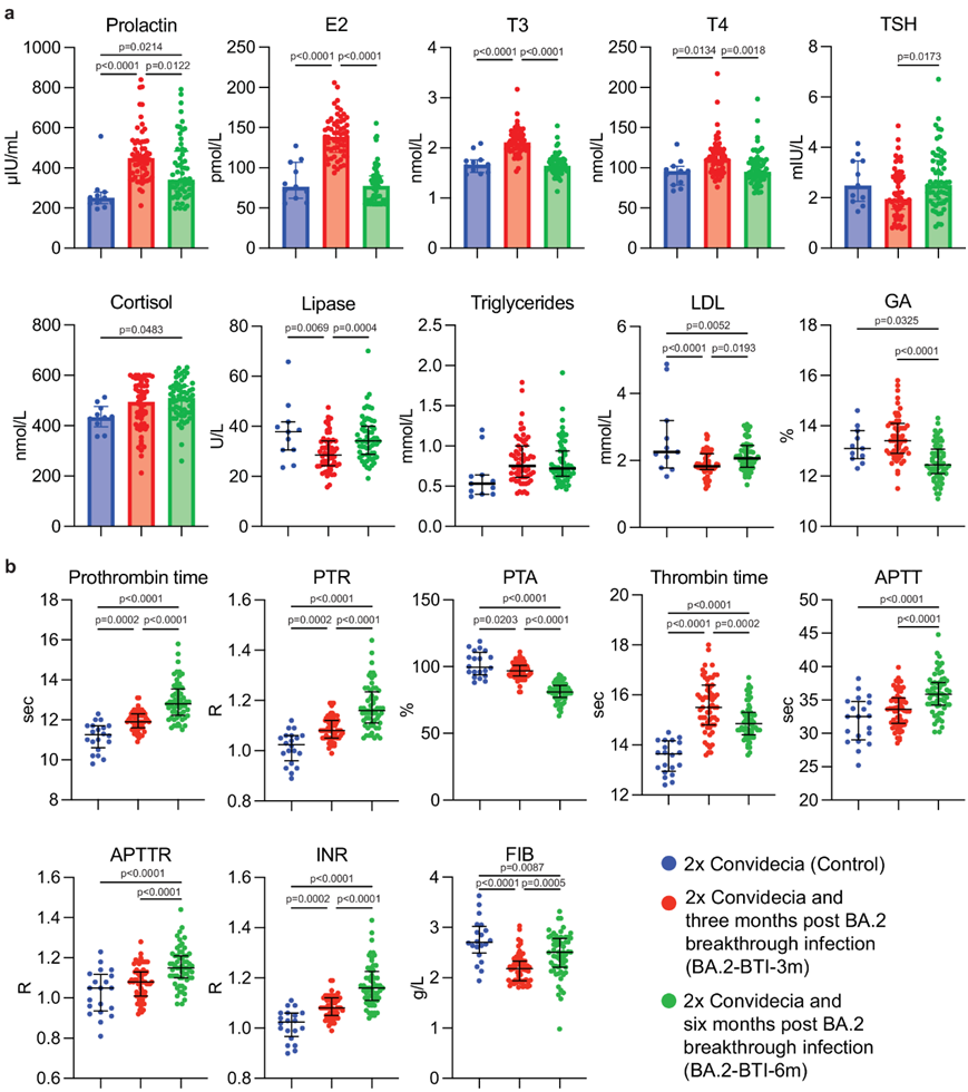 他们回顾性分析了与免疫和代谢相关的其他临床参数。特别是,BA.2 BTI后观察到激素紊乱,因为催乳素、雌二醇、T3、T4和皮质醇水平在BA.2 BTI后三个月上调,并且催乳素和皮质醇水平即使在六个月后也没有恢复正常(图8a)。各种激素的协调维持着机体的新陈代谢和功能。催乳素具有激素和细胞因子的生物活性,通过催乳素受体在T细胞、B细胞、NK细胞等免疫细胞上的表达,调节细胞免疫和体液免疫。但如果过度活跃,催乳素可能有害。皮质醇在机体的物质代谢、稳态应激反应、免疫功能和各器官的生理功能中起着至关重要的作用。重要的是,肝肾损伤和激素水平异常可引起代谢紊乱,中期血清葡萄糖水平(糖化白蛋白,GA)的极端变化表明,在ba2 BTI后6个月仍未恢复到对照组水平(图8a),这表明糖代谢长期受到影响。皮质醇促进糖原磷酸化酶的激活,这是肾上腺素对糖原分解的作用所必需的。因此,皮质醇的变化可能与免疫和GA异常有关。脂质代谢也受到干扰,脂酶和低密度脂蛋白(LDL)水平分别在BTI后3个月和6个月先下降后上升(图8a),但有恢复趋势。