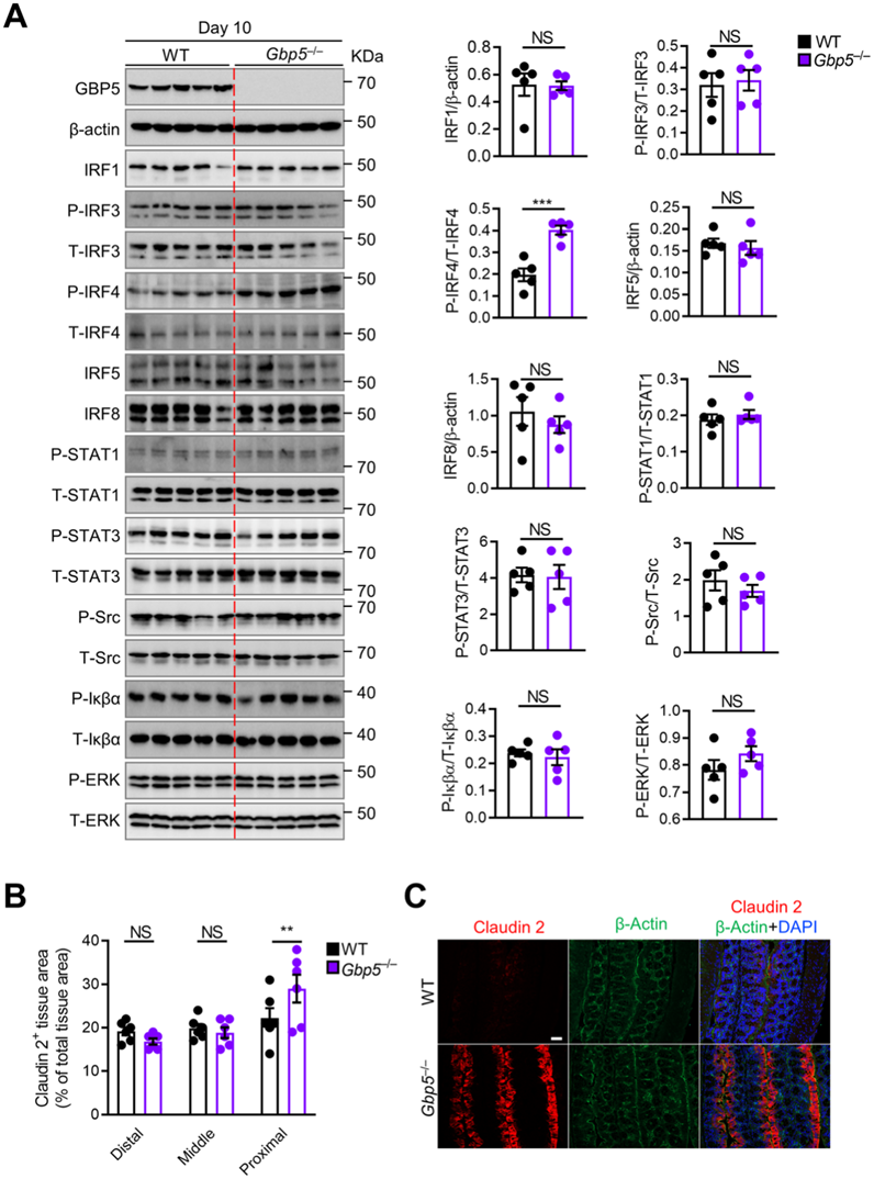 接下来,他们探讨了Gbp5 –/–小鼠的差异,这些差异可能在机制上与结肠炎抵抗力的增加有关。在组织学评估中检测到炎症、增生和溃疡的区域(即中段和远端结肠)检查紧密连接标记物claudin 2。紧密连接是确定在疾病缓解中受到调节的关键途径(图 2C),观察到许多紧密连接蛋白上调(图 2E),并且claudin 2 已与结肠炎进展建立了机制联系。在任一区域中均未发现claudin 2表达的差异(图 5B)。他们推测,任何分子变异都可能先于疾病发作,而组织损伤可能会掩盖可检测到的差异。因此,在两组均未检测到组织损伤的近端结肠中,他们评估了claudin 2的差异,并观察到Gbp5 –/–和WT小鼠之间的显著差异(图5B-C)。为了进一步评估这种关系,他们在接触DSS之前(第0天)和之后(第10天)检测了WT小鼠中claudin 2的表达水平。在结肠炎发生后,小鼠远端和中结肠的claudin 2水平显著降低,表明claudin 2水平与结肠炎的组织学检测相关,可能是Gbp5 –/–小鼠结肠炎耐药的关键。