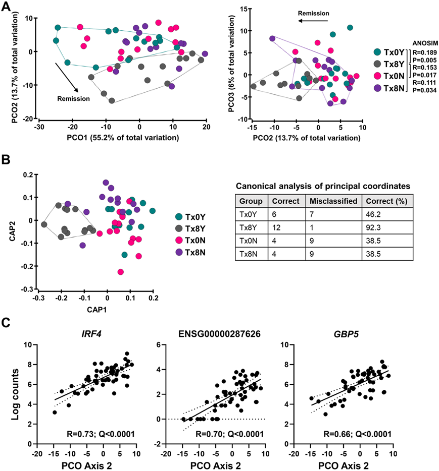 他们评估了在应答者(Tx0Y 与 Tx8Y)中显著调节的 78 个转录本横断面区分应答者和非应答者(Tx8N 与 Tx8Y)的能力。仅利用 78 个转录本计数的排序和多变量分析表明,Tx8Y 组与其他三组(Tx0N、Tx0Y 和 Tx8N)显著不同(图 3A),且治疗后在无应答者和应答者之间的主要差异(Tx8N与Tx8Y)出现在PCO2轴上(图 3A)。为了确定 78 个基因如何对患者样本进行分类,应用了主坐标(CAP;约束排序)的规范分析,结果表明 FMT(Tx8Y)后的应答者是唯一以高精度分类的群体(图3B)。这表明粘膜分子反应在某种程度上可能反映了治疗反应的梯度性质。