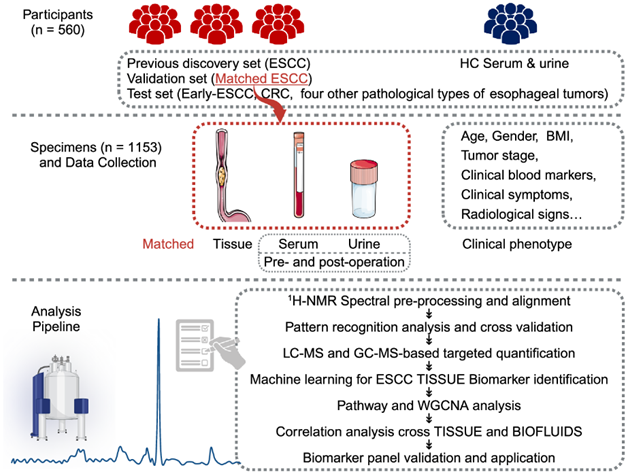 在这项多中心回顾性分析中,研究团队纳入了来自中国南方三个中心的 560 名参与者,总样本量为 1153 人,以探讨与 ESCC 相关的代谢改变(图1)。
