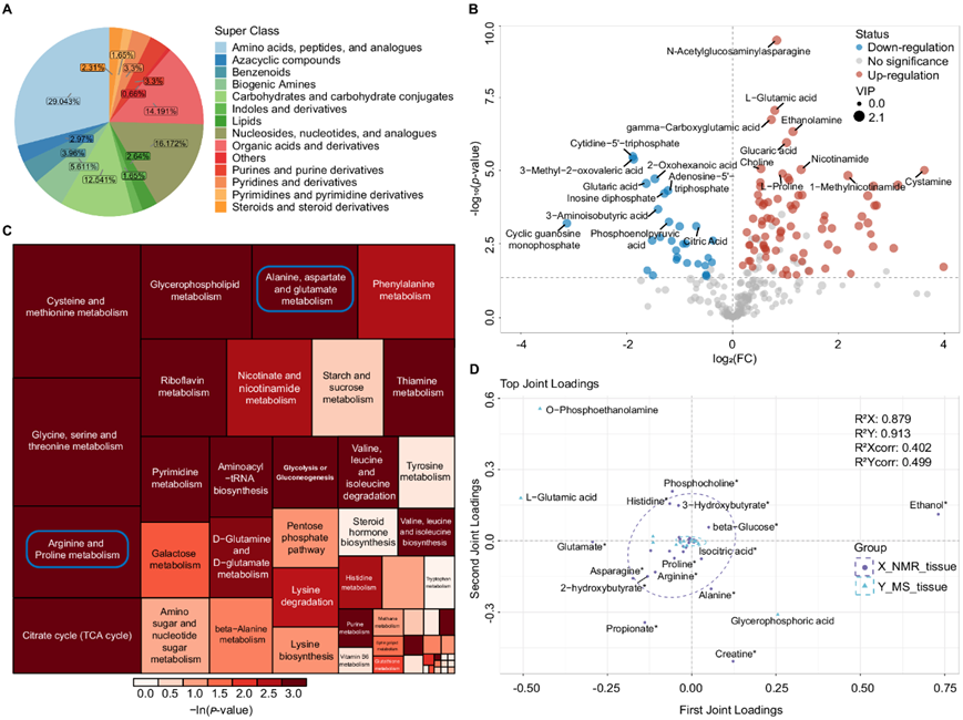 (a) 量化代谢物类别的饼图。(b) 对早期 ESCC 组织样本与正常对照进行火山图分析。(c) 早期 ESCC 组织样本中最富集的 KEGG 通路的树图。(d) 基于核磁共振和质谱的代谢组学分析了关键差异代谢物的O2PLS加载图。