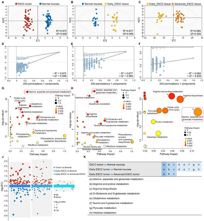 (A-C) OPLS-DA 评分图基于不同阶段 ESCC 患者的1 H-NMR 组织光谱。(D-F) 通过排列分析(200 次)对相应模型进行统计验证。 (G-I) 代谢通路分析。 (J) 基于同一批样本的多火山图,显示不同组之间差异代谢物的比较。 (K) ESCC进化过程中主要代谢通路紊乱的统计分析。