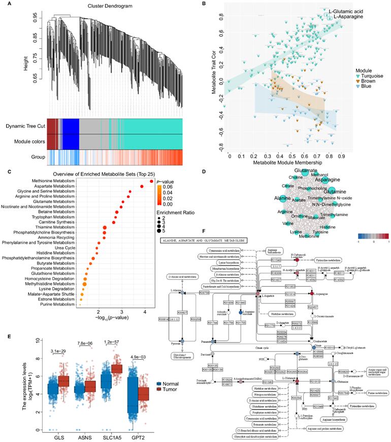 加权基因共表达网络分析 (WGCNA) 用于探索早期 ESCC 的关键驱动代谢模块。为了比较早期 ESCC 组织和正常粘膜,他们将代谢物分为四个模块(图 5A)。有两个模块很重要:绿松石模块有 172 种代谢物,蓝色模块有 45 种代谢物。绿松石模块具有最高的权重,并且谷氨酸和天冬酰胺水平与特征代谢物水平最相关(图 5B)。Turquoise模块的功能富集分析显示了各种氨基酸代谢在驱动该模块中的作用(图 5C)。来自“丙氨酸、天冬氨酸和谷氨酸代谢”通路的关键分子确定为关键代谢物,与早期的KEGG代谢通路分析一致(图5D)。