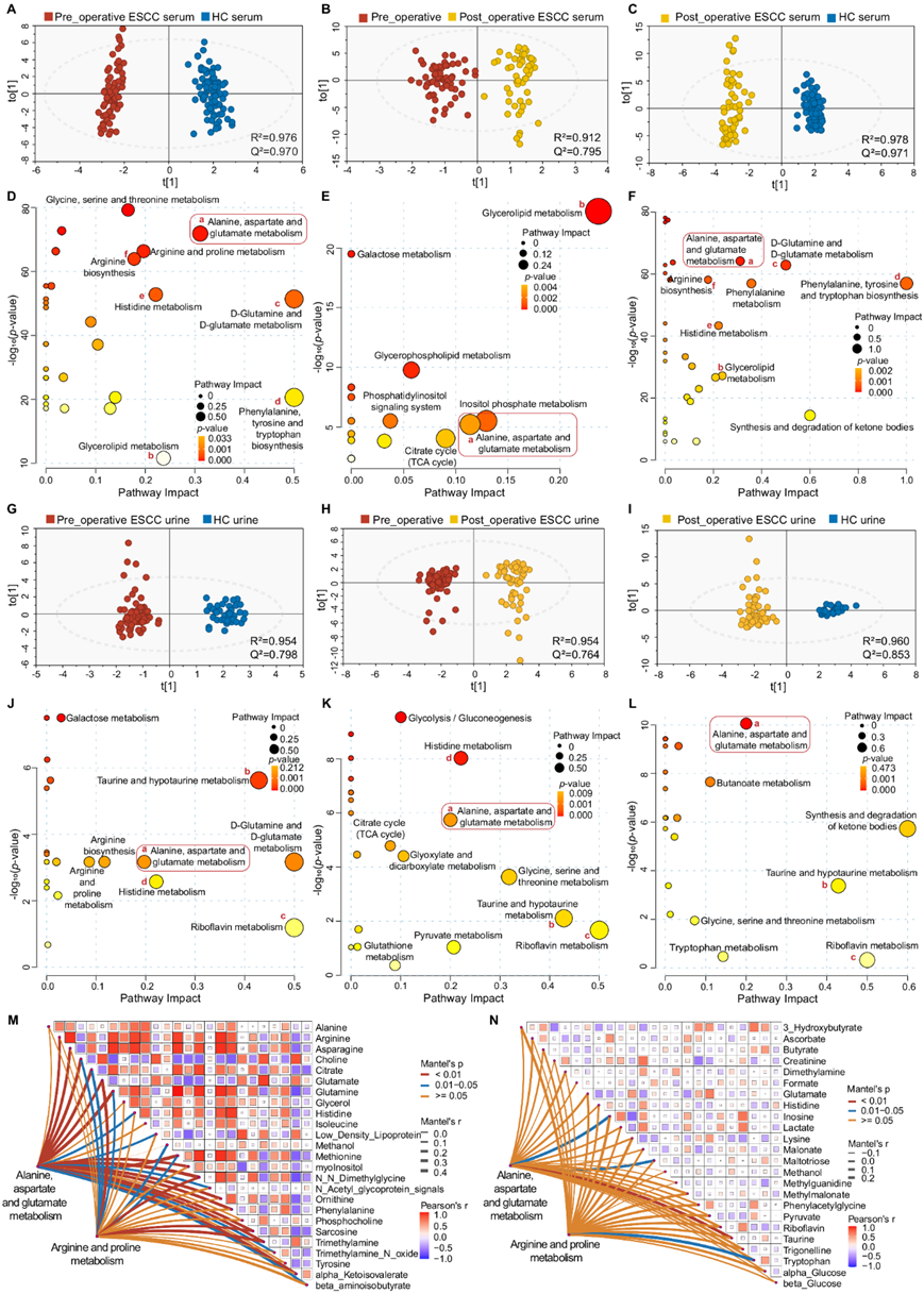 (a-c) 各组间1H-NMR血清谱的OPLS-DA评分图。(D-F)ESCC患者血清的代谢通路分析。(G-I)各组间尿液的OPLS-DA评分图。(J-L) ESCC患者尿液中区别代谢物的代谢通路分析。(M-N) 早期 ESCC 患者组织代谢组和血清代谢组以及尿液代谢组之间的相关程度。
