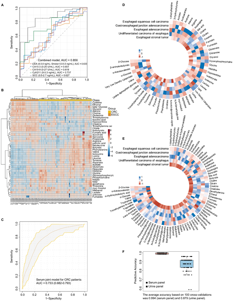 (a) 对临床常用的五种肿瘤生物标志物(CEA、CA15-3、CA19-9、Crfr211、SCC)进行 ROC 分析,区分 ESCC 和 HC。(b) 所有代谢物中 ESCC 和 CRC 组的无监督层次聚类。(c) ROC曲线显示血清联合模型对CRC患者的诊断效果较差。(d-e) Circos热图比较不同病理类型食管肿瘤的血清和尿液代谢谱。 (f) 基于 SVM 的分类器的性能通过 ROC 曲线进行检测,并通过 100 倍交叉验证进行评估。