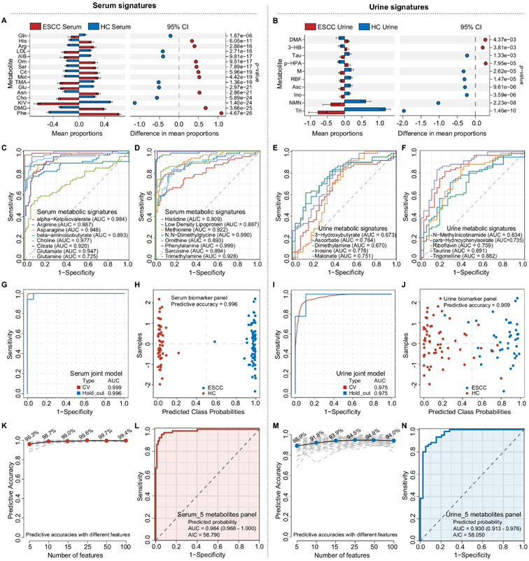 (a-B) STAMP分析显示ESCC组和HC组之间血清和尿液代谢物生物标志物的表达差异。(C-F) 16个血清和10个尿液代谢特征分别区分ESCC和HC的ROC曲线AUC。 (G-n) AUC 的最佳分类器预测每个样本的类别概率。