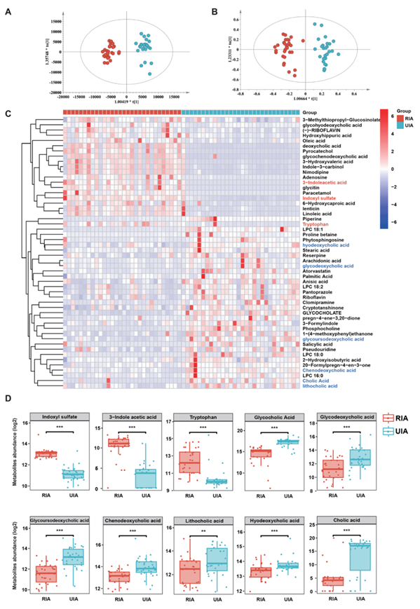 鉴于微生物代谢基因功能的改变可引起宿主循环代谢物水平的变化,他们对珠江医院30例RIA患者和30例UIA患者的血浆样本进行非靶向代谢组学研究,初步构建不同阶段IA患者的差异代谢物谱(图1)。采用正交偏最小二乘判别分析(OPLS-DA)模型对RIA和UIA患者血浆样本的代谢差异进行初步评价。结果表明,在正离子和负离子模式下,RIA组和UIA组血浆代谢物均有明显分离(图4A-B)。OPLS-DA排列检验也显示出对分类变量的高解释和预测能力。因此,他们在RIA患者和UIA患者的血浆中鉴定出52种差异表达的代谢物。热图显示了RIA患者中差异表达的33种代谢物,主要包括氨基酸和吲哚化合物。此外,UIA患者的19种代谢物水平显著升高,其中以胆汁酸为主(图4C-D)。