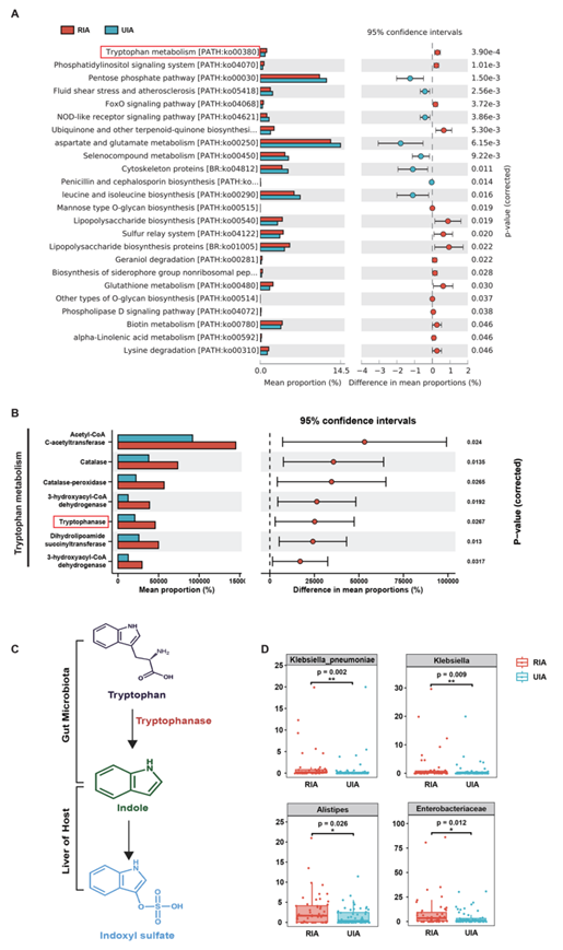 (A) UIA和RIA代谢通路的差异。(B) RIA富集了色氨酸代谢通路基因。(C) 色氨酸-吲哚代谢通路。(D) 对色氨酸含量有贡献的微生物群。