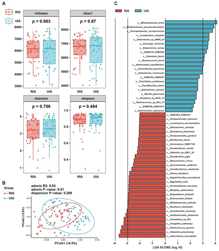 (A) 箱线图显示了UIA组和RIA组之间的alpha多样性比较。(B) 基于PCoA的β多样性分析,表明组间分布不同。(C) 柱状图显示了UIA组和RIA组之间差异富集特征计算的LDA得分。