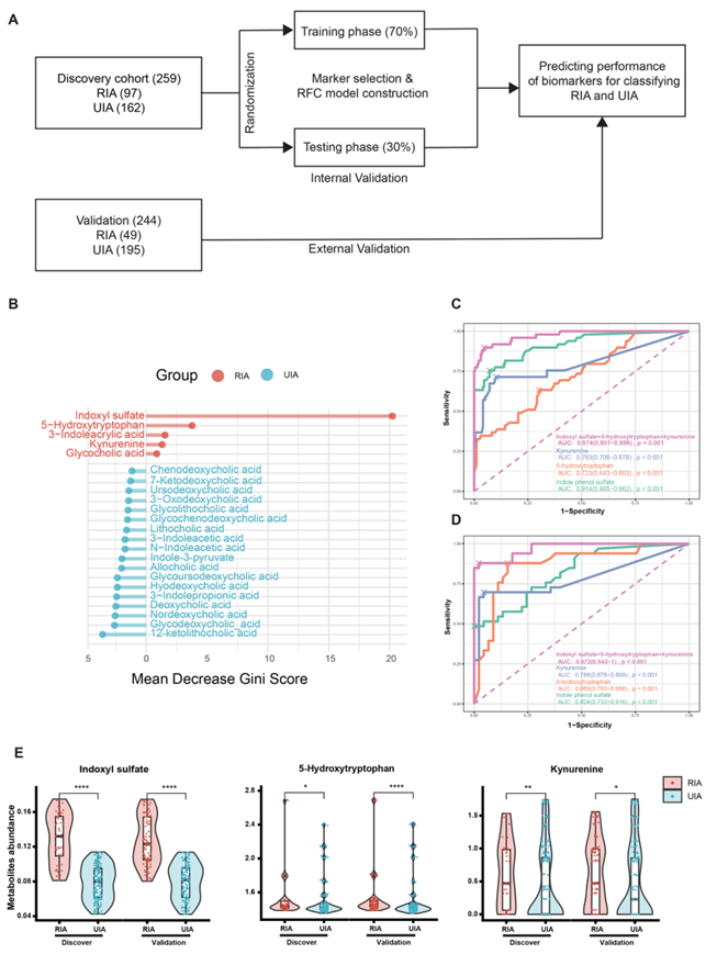 (A) 随机森林模型的研究设计和流程图。(B) 分类UIA和RIA的候选代谢物。(C) 测试集的ROC曲线。(D) 验证集的ROC曲线。(E) 两个队列中代谢标志物含量的箱线图。