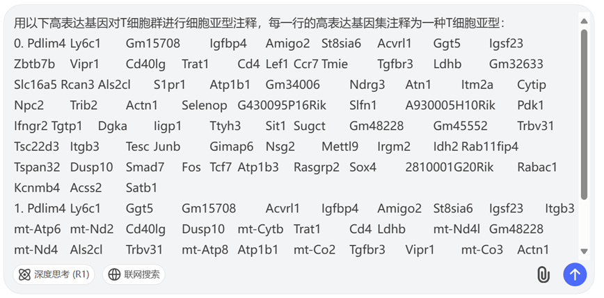 首先,找到标准分析结果中提取的每个Cluster差异高表达基因top250列表,复制粘贴到DeepSeek对话框中,并给出相应限定描述,点击发送,静等结果。