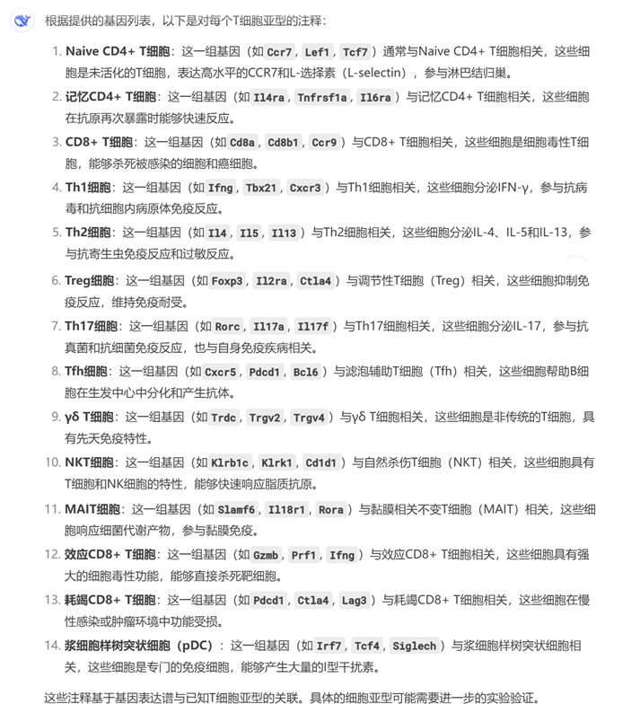 根据这个结果,从差异基因列表中搜索判断DeepSeek给出的标记基因的特异性,再根据该项目的生物学背景和结果预期,锁定9种T细胞亚型。