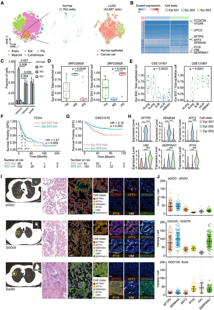 GGO的早期发现显著提高了肺癌患者术后的总体生存率。然而,在具有亚实性部分的 GGO 中出现肺癌细胞状态 Epi S03 显示出较差的临床结果(图 2F-G)。
