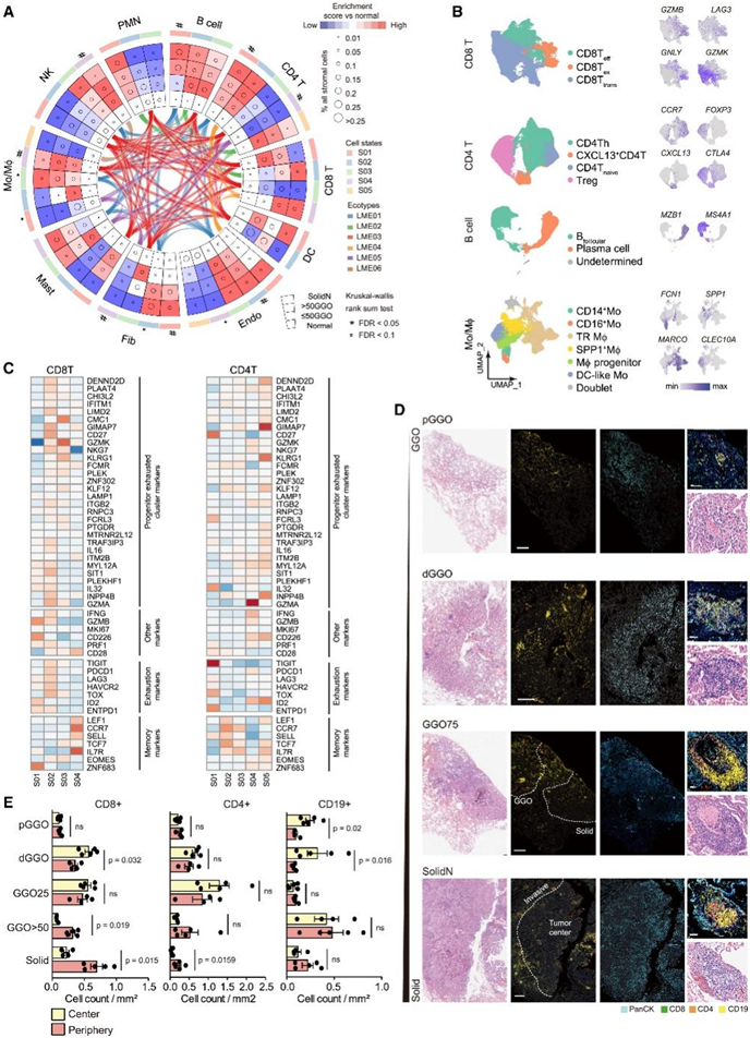 (A) GGO 和实体结节性肿瘤相对于正常肺组织的免疫细胞状态的组成变化。(B) UMAP可视化。(C) 热图显示 (A) 中 CD8+T 和 CD4+T 细胞状态中选择记忆和祖细胞耗竭淋巴细胞相关标记物的表达。(D) 多重免疫荧光检测肺腺癌进展时三级淋巴结构 (TLS) 的形成。(E) 基于 QuPath 的肿瘤中心和肿瘤周边细胞计数定量。