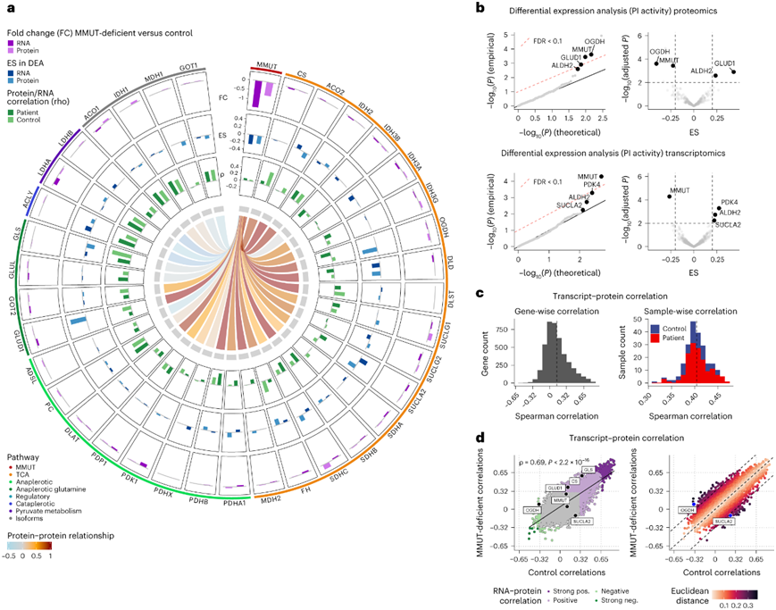(a) Circos 图描绘了转录本和蛋白质的差异倍数 (FC)、差异表达分析得出的效应大小 (ES)、转录本-蛋白质相关性 (rho) 以及 MMUT 蛋白质与 TCA 蛋白质及其相应亚型的相关关系。 (b) Q-Q和火山图说明了基于线性混合建模方法的差异表达分析的结果。(c) 4318个转录蛋白对(左)和221个样本(右)的Spearman相关性直方图。 (d) MMUT 缺陷与对照的 Spearman 相关性散点图。