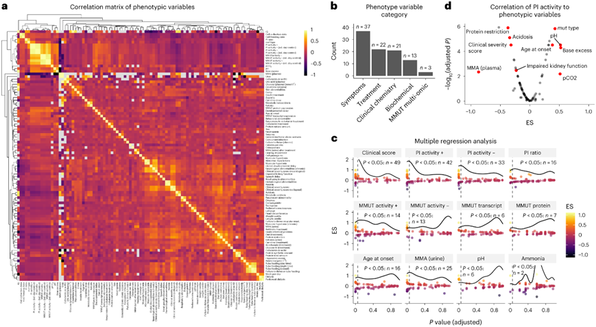 多重相关分析发现,在羟钴胺素(PI+)存在的情况下,PI与42个表型特征显著相关,是所有个体连续变量中相关性最大的(图2c)。例如,这与发病年龄形成对比,后者仅与16个参数显著相关(图2c)。进一步检测发现PI+与疾病严重程度呈负相关,包括与pH或发病年龄显著正相关,与血浆中甲基丙二酸浓度、存在临床干预措施负相关(图2d)。