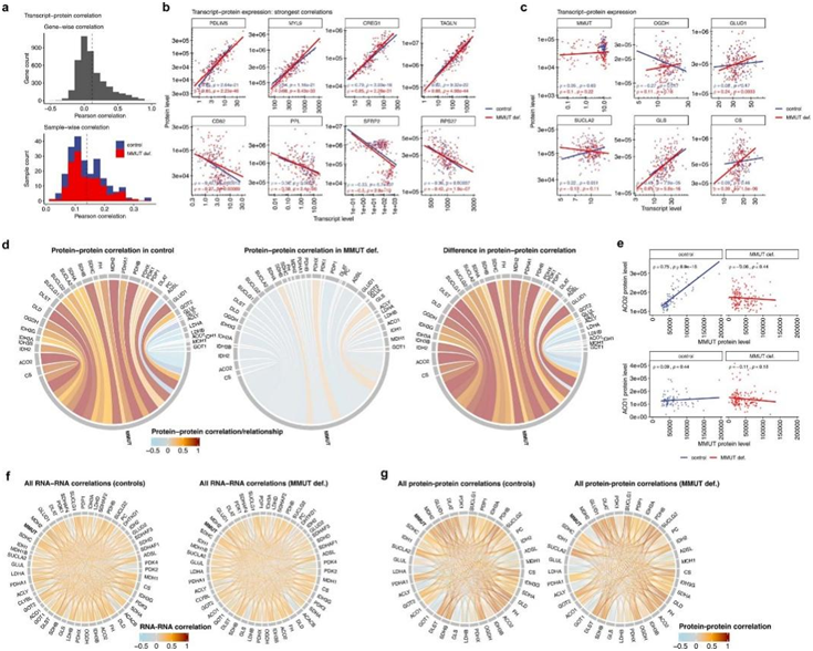 图4. 转录本-蛋白质和蛋白质-蛋白质相关性分析揭示了 MMUT 和 TCA 基因和蛋白质之间的协调关系,但不是它们的亚型。