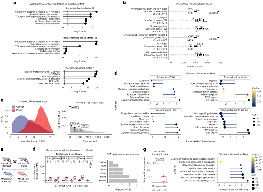 (a) 使用多组学因子分析工具(MOFA)进行基因集富集分析。(b) 蛋白质组数据中MOFA之后的顶级富集基因集的详细特征统计。(c) 转录本的线性判别模型将 MMUT 缺陷与由MMUT和与 TCA 循环相关的其他基因驱动的控制分开。(d) 基于差异表达分析得出的ES排序的基因集富集分析。(e) Mmut缺陷小鼠的饲养方案。(f) 小鼠组织和体液中的非靶向代谢组学。(g) 小鼠脑组织的RNA-seq。