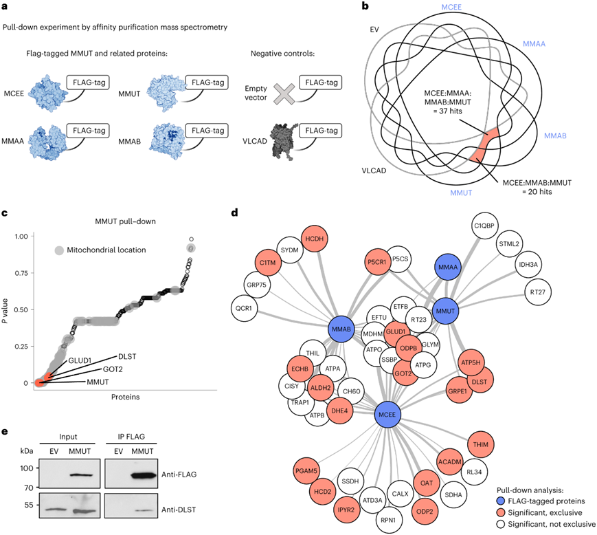为了深入了解这种潜在的物理关系,他们利用了293T细胞中c端flag标记的功能性MMUT版本的过表达,MMUT辅助因子(MMAA和MMAB)和底物(MCEE)合成的三个途径成员参与任何含有MMUT的多蛋白复合物,以及三个阴性对照[空载体(EV)、VLCAD和ACO2)](图6a)。他们对四种 MMUT 途径蛋白(MMUT、MMAA、MMAB 和 MCEE)和两个阴性对照(EV 和 VLCAD)进行了 IP 联用质谱分析。他们鉴定了37个由MCEE、MMAA、MMAB和MMUT拉下而不由EV或VLCAD拉下的靶标蛋白,包括MMUT、OGDH、DLST和GOT2,以及20个由MCEE、MMAB和MMUT拉下而不由EV或VLCAD拉下的蛋白质,包括MMAB和GLUD1(图6b)。对MMUT与EV和VLCAD的生物重复进行方差分析(ANOVA),发现MMUT样品中有22个蛋白显著富集(图6c)。所有的蛋白都由UniProt标记为具有线粒体定位,包括GLUD1、GOT2和DLST(图6c)。方差分析比较了MMUT、MMAA、MMAB和MCEE中至少三种蛋白的重叠,但EV或VLCAD均未鉴定出11种相互作用蛋白,包括GLUD1和GOT2;而MMUT、MMAA、MMAB和MCEE两种阴性对照的交叉鉴定出包括DLST在内的13种相互作用蛋白(图6d)。最后,通过免疫印迹进一步证实MMUT和DLST之间形成复合物(图6e)。这些数据表明MMUT是近端代谢酶复合物的一部分,包括GLUD1和氧戊二酸脱氢酶复合物组分DLST,并表明这些相互作用的破坏可能是它们在疾病中的调节改变的基础。