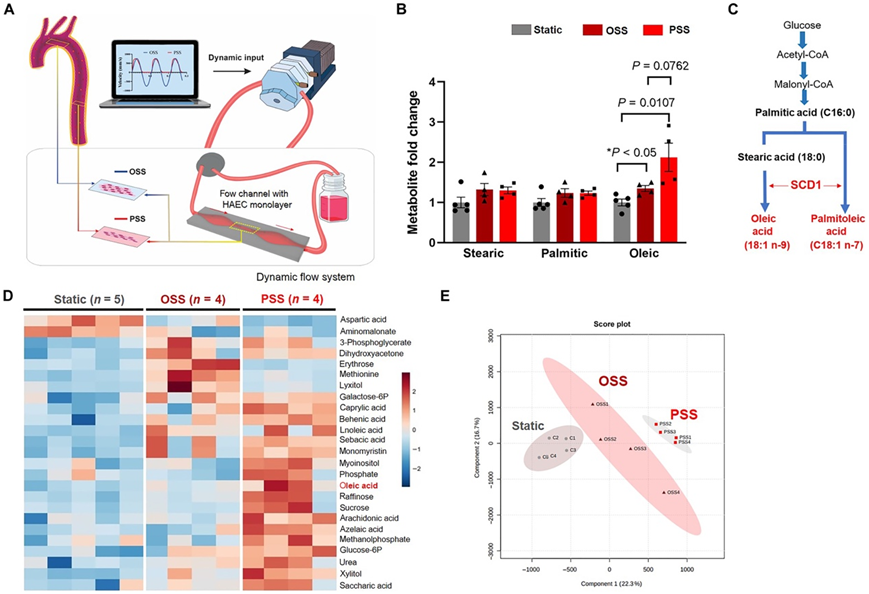 (A) 使用定制的动态流动系统来模拟动脉系统中剪切应力的空间和时间变化。(B)在静态条件、OSS或PSS下从HAEC裂解物中收集代谢物样本,用于非靶向代谢分析。(C) MUFA的生物合成描述了SCD1催化SFA(棕榈酸和硬脂酸)转化为MUFA(棕榈油酸和油酸)的限速步骤。(D)热图显示糖酵解物和脂肪酸代谢物均增加。(E)主成分分析(PCA)的评分图显示了代表性内皮代谢物的分离。