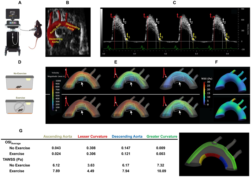 (A)获取麻醉小鼠b型和PW型多普勒图像的超声系统示意图。(B)小鼠主动脉弓及三支、降主动脉的代表性B模图像及分割图。(C)在四个心电图门控心动周期内,从小鼠升主动脉获得PW多普勒测量。(D)小鼠在静态状态和自愿跑轮的示意图。(E)沿主动脉弓的速度色流线表明在小曲度处出现了紊乱的血流,而运动增强的剪切应力减轻了易发生紊乱血流的小曲度处的血流再循环。(F)计算几个心动周期的时间平均壁面剪切应力(TAWSS),并比较不运动和自主轮跑之间的差异。(G)在小弯度(升主动脉、主动脉弓和降主动脉)和大弯度之间比较OSIave(表面平均值)和TAWSS。