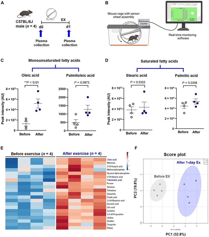 (A) 动物运动 (EX) 方案的示意图。(B) 自愿轮跑系统提供啮齿动物跑步活动的实时监控。(C)二十四小时运动增加OA和PA。(D) 运动不会改变 SFA 硬脂酸和棕榈酸的血浆水平。(E) 运动前后血浆代谢物的热图。(F) PCA 得分图。