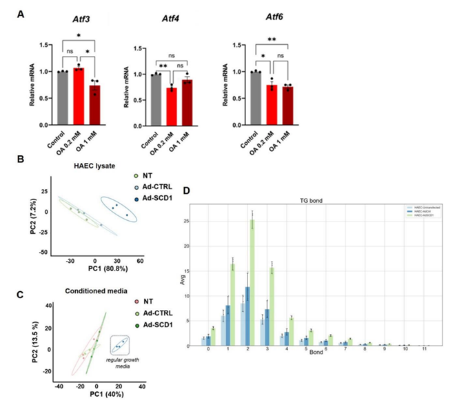 (A) OA降低了内质网应激相关基因Atf3、Atf4和Atf6的表达。(B-C)在未转染(NT)或转染腺病毒(Ad-CTRL或Ad-Scd1)的HAEC细胞裂解液或条件培养基中定量的单个脂质PCA。(D)甘油三酯(TG)键分析表明,Scd1过表达显著增加了含有一个、两个或三个双键的细胞TG。