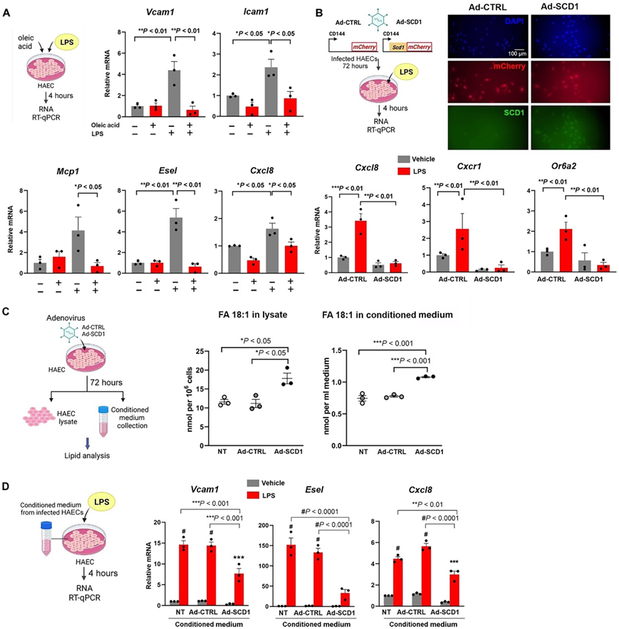 (A)逆转录定量聚合酶链反应 (RT-qPCR)。(B)用腺病毒对照或腺病毒感染HAEC以过表达Scd1并进行LPS处理。(C) 用腺病毒对照或腺病毒转染 HAEC 以过表达 Scd1。(D)将在常规培养基中生长的HAEC单层改为从NT、Ad-CTRL和Ad-Scd1的HAEC收集的条件培养基,在存在或不存在LPS (20ng/ml)的情况下培养4小时。