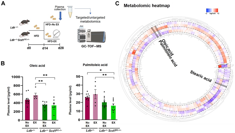 (A) 实验方案。 (B) Ldlr −/−小鼠运动后绝对血浆 OA 浓度升高,而Ldlr −/− Scd1 EC−/−小鼠运动后 OA 浓度降低并保持降低状态。(C)非靶向代谢组学分析的圆形热图捕获了已知和未知的身份(ID)代谢物,并突出了使用Pareto方法归一化和缩放后OA和PA的变化。