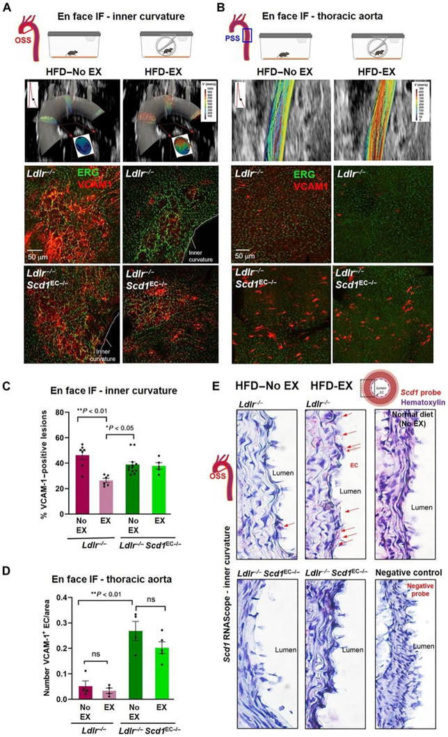 自愿轮跑2周后,自主转轮运行2周后,主动脉内皮的表面免疫疗法显示Scd1在主动脉弓下曲和降主动脉中的表达增加(图4B-D)。Scd1 染色在亚细胞核周区域突出,与报道的 ER 区域一致,而内皮特异性缺失 Scd1 (Scd1EC−/−) 小鼠中不存在 Scd1 染色。使用Scd1特异性探针的原位杂交(RNAscope)证实了野生型小鼠运动后主动脉弓和降主动脉内皮Scd1表达增加(图4E)。总之,运动增强的 PSS 与激活内皮 Scd1 表达有关。
