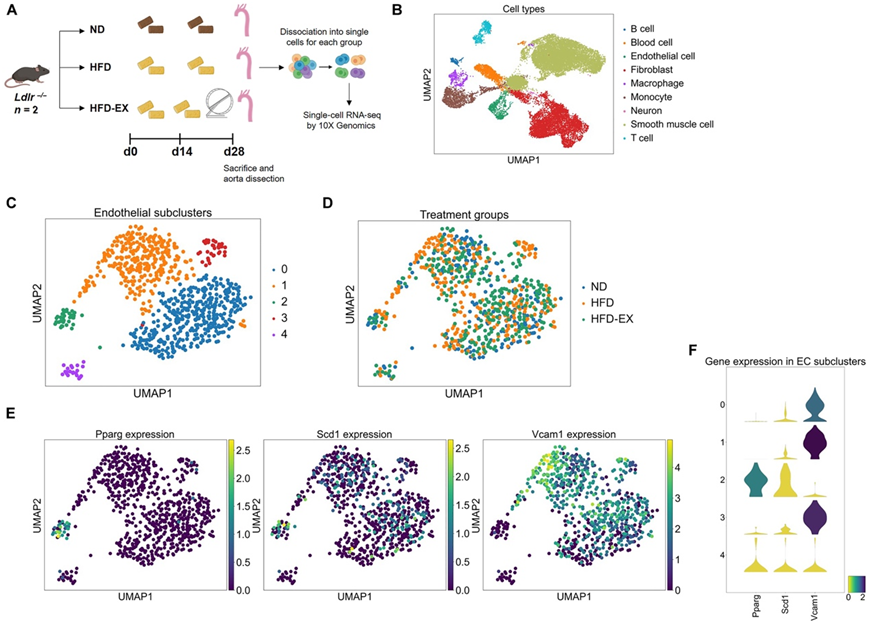 (A)实验方案示意图。(B-D)UMAP可视化。(E-F) Ppar γ、Scd1和Vcam1表达的变化可识别内皮亚聚类,其中较高水平的Ppar γ 和Scd1与低水平的Vcam1表达相关。