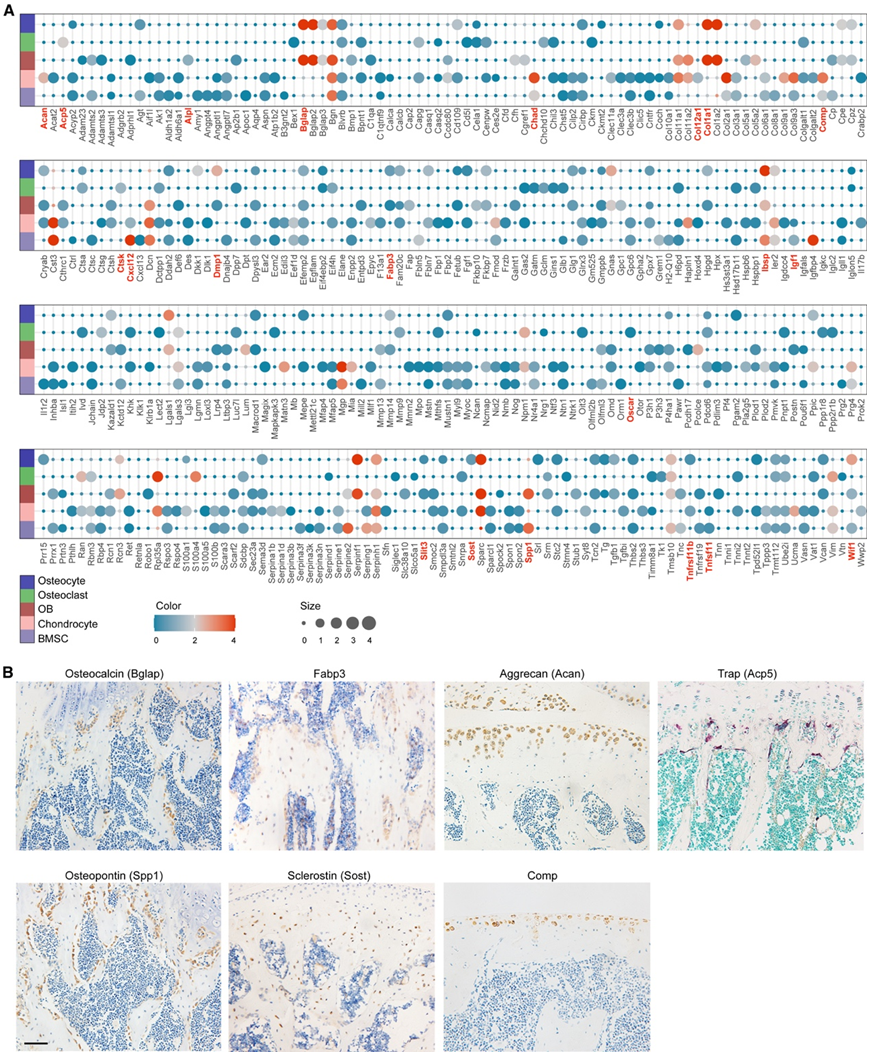 确定了几种众所周知的骨因子的细胞来源,证实了该研究预测的准确性(图 5 B)。骨钙素和骨桥蛋白是两种 OB 标志物,在位于骨表面的 OB 中特异性表达。破骨细胞标记基因 Acp5 和 Ctsk 分配给破骨细胞。通过TRAP染色可以在骨表面观察到多核破骨细胞。嵌入骨基质中的骨细胞表达标记物Sost。软骨细胞标记物 Acan 和 Chad 仅在软骨细胞中表达。免疫组织化学 (IHC) 测定证实了 Acan 在关节软骨中的表达模式。新鉴定的骨因子,例如 Fabp3 和 Comp,显示细胞来源与预测结果一致(图 5 B)。