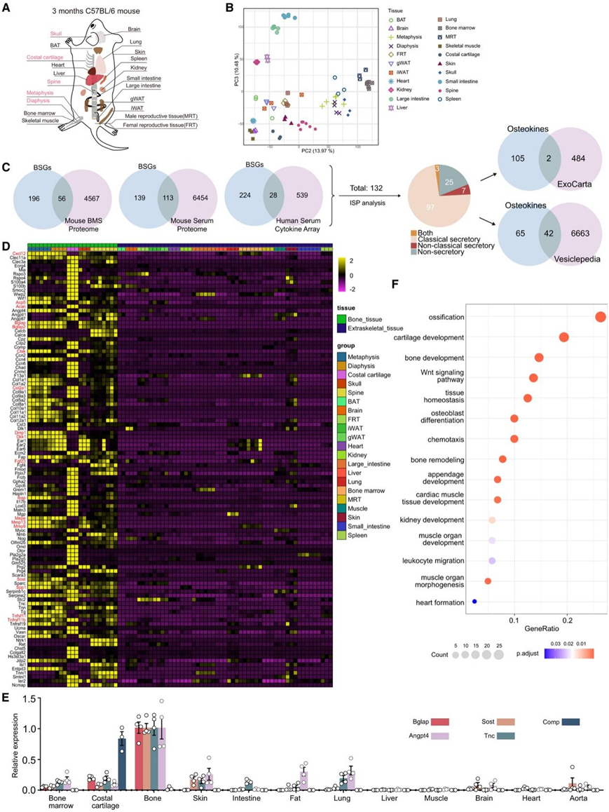 (A) 样本描述。(B) RNA-seq 数据的主成分分析 (PCA)。 (C) 比较细胞外液(血清和骨髓上清液 [BMS])中检测到的骨特异性基因 (BSG) 和蛋白质并预测分泌。(D) 热图显示骨特异性骨因子 (BOK) 的表达。(E) 通过 qPCR 验证 Bglap、Sost、Angpt4、Tnc 和 Comp 的表达。(F) BOK 的基因本体生物过程 (GO_BP) 注释。