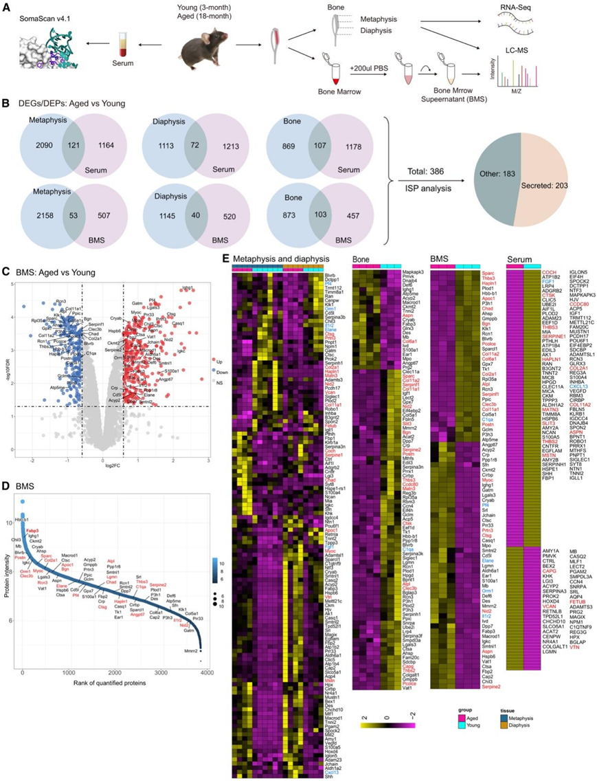(A) 年轻和老年小鼠骨组织的转录组学和蛋白质组学以及 BMS 和血清的蛋白质组学的工作流程。(B) 骨中差异表达基因 (DEG) 和差异表达蛋白 (DEP) 与细胞外液(血清和 BMS) 中 DEP 的比较以及分泌物的预测。(C) 火山图显示 BMS 中的蛋白质,其中蛋白质随年龄增加(红色)和减少(蓝色)。(D)对 BMS 蛋白进行排序。 (E) 热图显示干骺端、骨干、骨、BMS 和血清中的 AOK 表达。