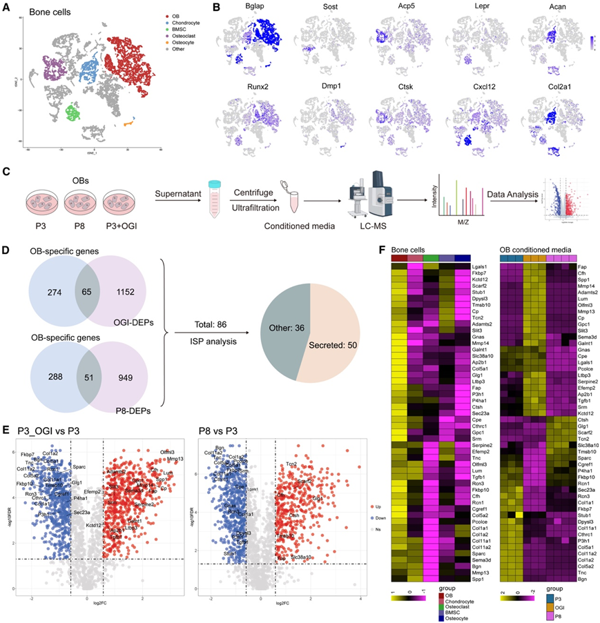 (A) 骨细胞的 t-SNE 可视化。(B) t-SNE 图显示 OB (Bglap/Runx2)、骨细胞 (Sost/Dmp1)、破骨细胞 (Acp5/Ctsk)、BMSC (Lepr/Cxcl12) 和软骨细胞 (Acan/Col2a1) 中标记基因的标准化表达水平。(C) 连续传代 (P3-P8) 中具有成骨诱导 (OGI) 的 OB 条件培养基的蛋白质组学工作流程。(D) OB 特异性基因与具有 OGI 的 OB 条件培养基中的 DEP 的比较以及分泌的连续传代和预测。(E) 火山图显示 OB 分泌的骨因子 (OBK),红色/蓝色表示 OGI 和传代导致的增加/减少。(F) 热图显示骨 scRNA-seq 数据和 OB 分泌组中 OBK 的表达。