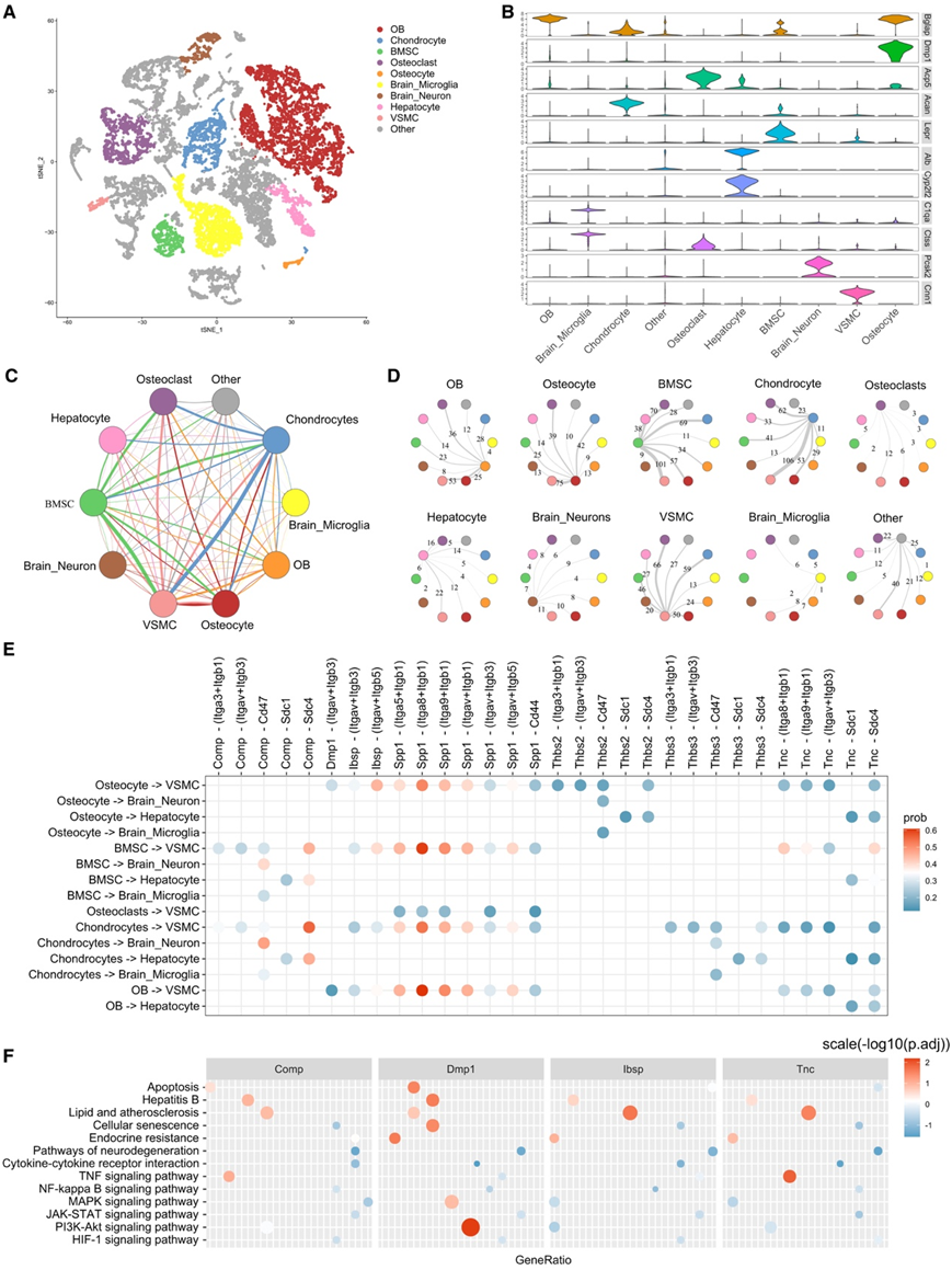 (A) 来自骨、肝、脑和主动脉的细胞的 t-SNE 可视化。(B) 类型特异性标记基因表达值的小提琴图。(C) 连接图以彩色圆圈显示一种细胞类型与另一种细胞类型之间相互作用的强度。(D) 圆形图显示细胞相互作用;黑色数字代表配体-受体对计数;箭头粗细表示相互作用强度。(E) 气泡图呈现跨细胞类型的配体-受体对。(F)配体-受体激活下游基因的KEGG通路分析。