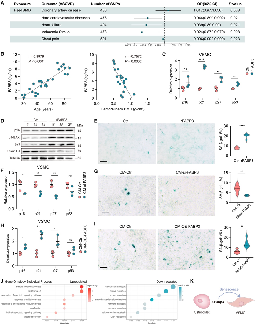 (A) 采用逆方差加权法对足跟骨矿物质密度 (BMD) 和动脉粥样硬化性心血管疾病 (ASCVD) 进行孟德尔随机化分析。(B) Pearson 相关系数显示 18-88 岁男性血清 FABP3 水平、年龄和股骨颈 BMD之间的个体相关性。 (C-E) 用鼠重组 FABP3 培养原代小鼠 VSMC。(F–I) 用来自 FABP3 耗尽或过表达的 OB 的条件培养基培养原代小鼠 VSMC。(J) 用鼠重组 FABP3 处理的 VSMC 中 DEG 的 GO_BP 注释。(K) 衰老 OB 通过 FABP3 将衰老传播到 VSMC 的模型。