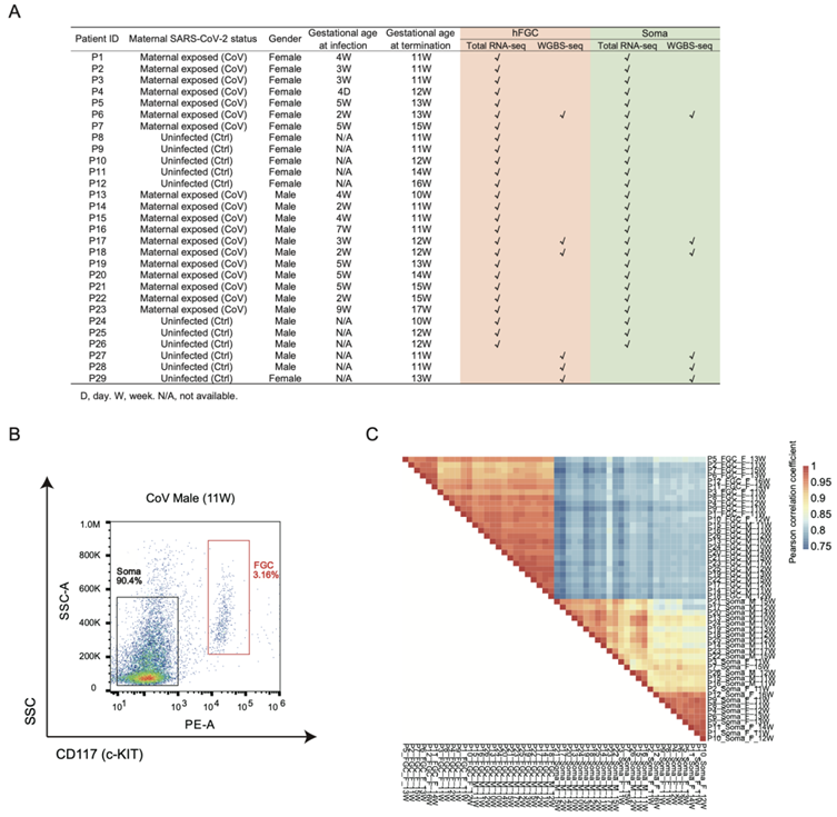 (A)用于全转录组测序(RNA-seq)和全基因组甲基化测序(WGBS-seq)的发育中胎儿样本的详细信息。(B)男性生殖腺在母体感染后的代表性FACS图像。(C)显示所有转录组Pearson相关系数的热图。