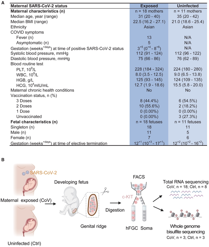 (A) 收集样本的母体和胎儿临床特征。(B) 母体感染 SARS-CoV-2 或未感染时,发育中胎儿的胎儿生殖细胞 (FGC) 和性腺体细胞 (soma) 的转录组学和表观基因组学数据的生成示意图。